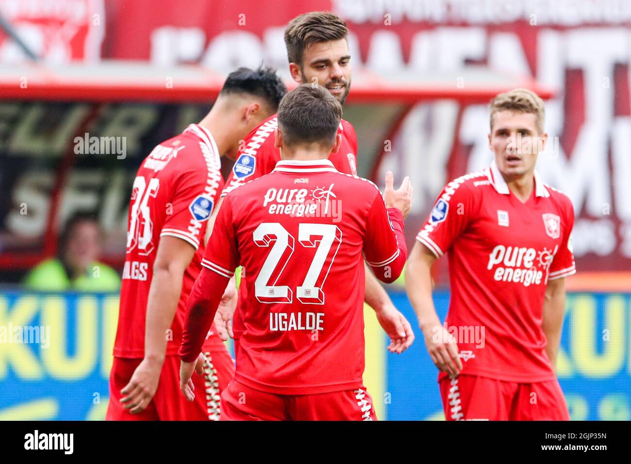 Enschede Stadium De Grolsch Veste 18 08 2019 Season 2019 2020 Dutch Eredivisie Final Result 3 3 Fc Twente Player Haris Vuckic L And Fc Twente Player Emil Berggreen R Celebrating The